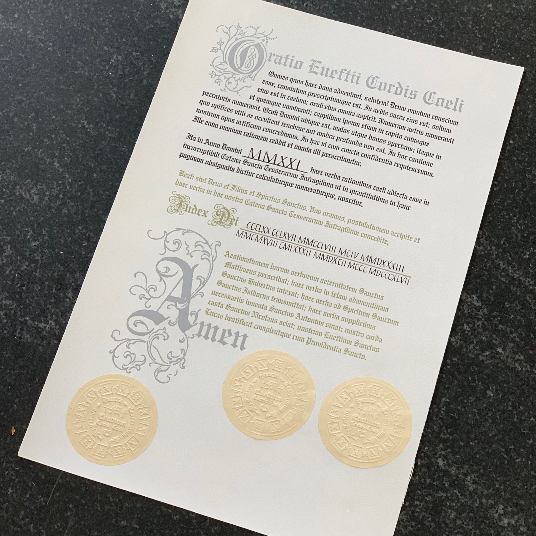 The Eneftium certificate is letterpress-printed in Gold, Silver and Black on a piece of 8″ x 12″ parchment, with the Index Dei and Anno Domini inscribed by a professional calligrapher. Each Index Dei is unique; the product image shows a sample Index Dei and is not indicative of the one shipped.